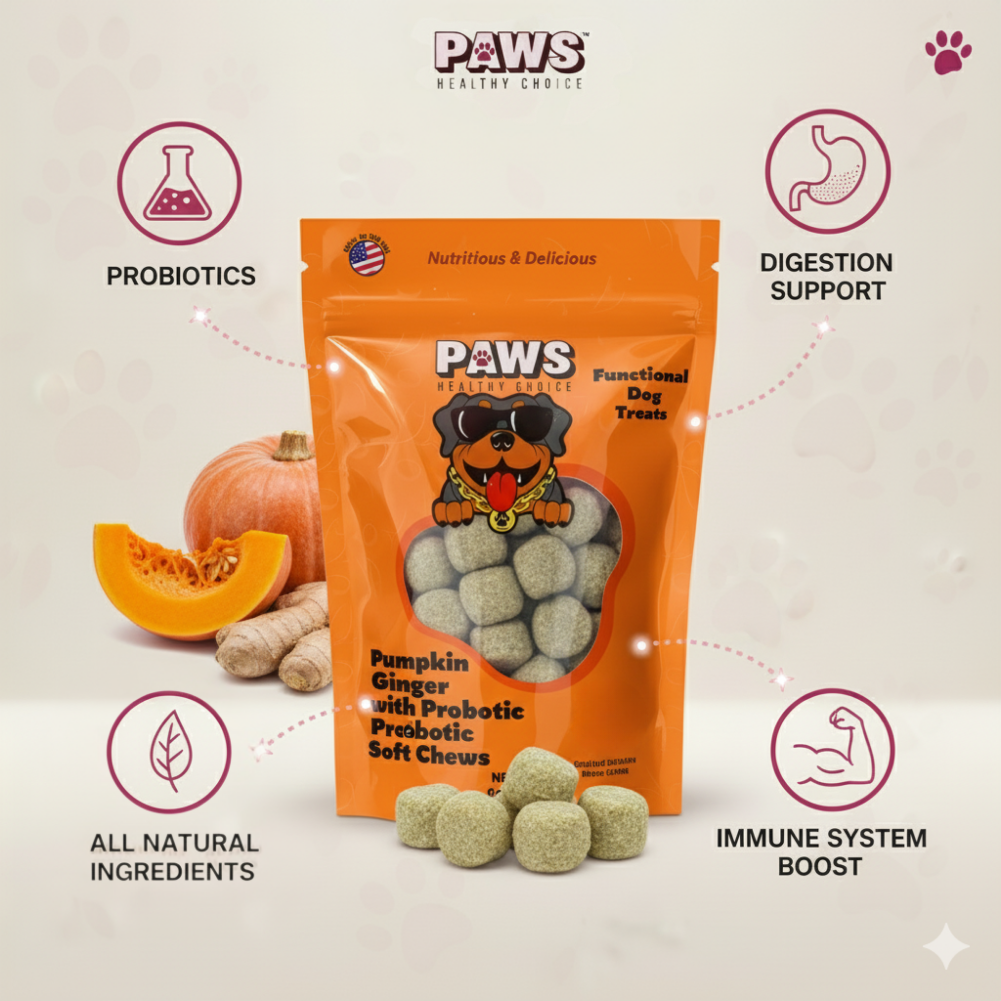 Supports Digestion – Pumpkin, ginger, and probiotics work together to regulate digestion, ease upset stomachs, and maintain a healthy gut.